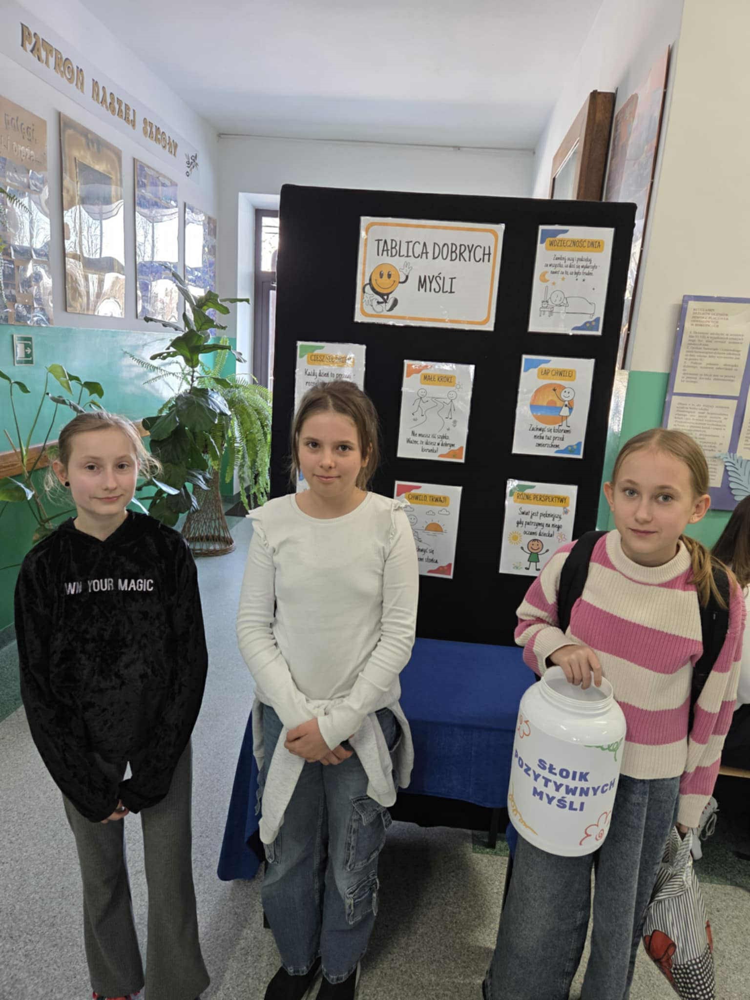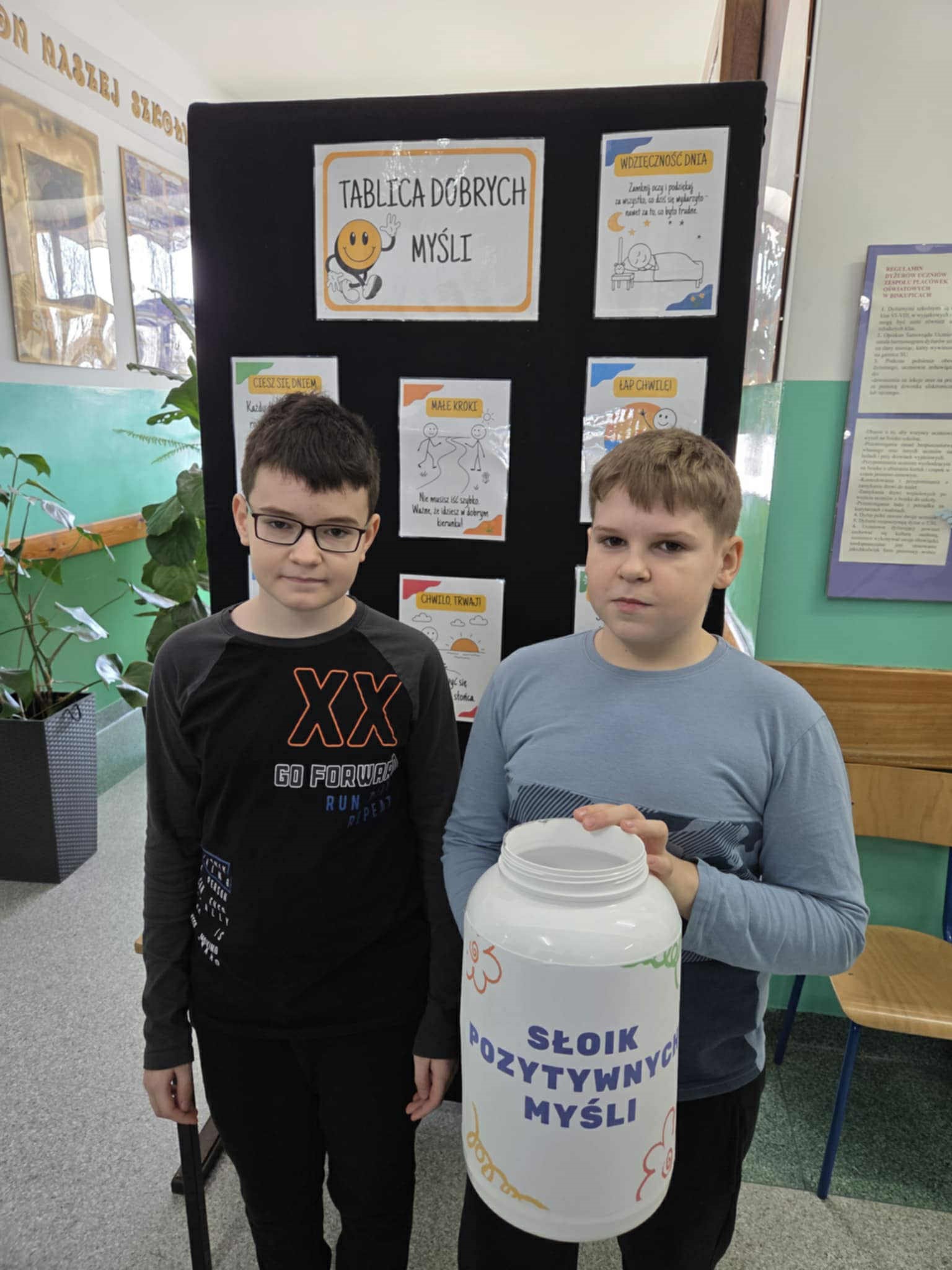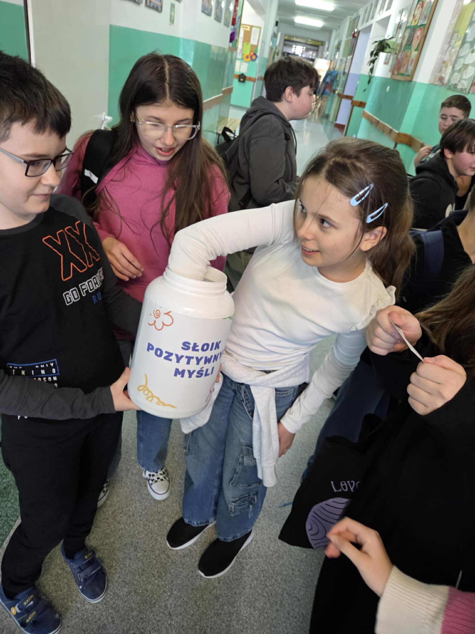 W naszej szkole uczniowie klasy V wraz z wychowawczynią przygotowali gazetkę tematyczną „Tablica dobrych myśli” oraz słoik dobrych myśli z kartami motywacyjnymi z dobrym słowem. Uczniowie podczas przerw rozdawali uczniom, nauczycielom oraz pracownikom bileciki z miłymi słowami.
